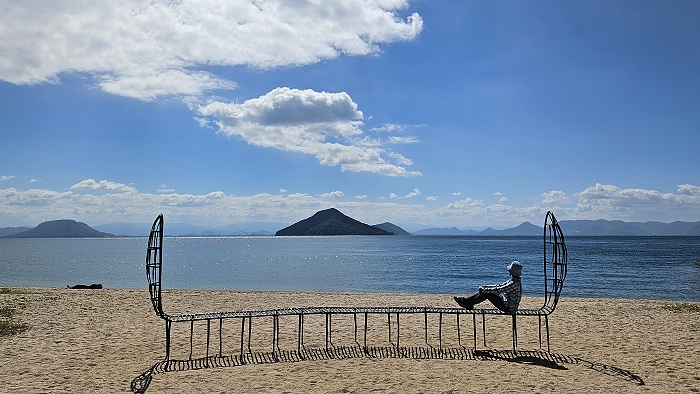 te19《Place for Sea Dreamers》,由澳洲藝術家Heather B. Swann 與建築師Nonda Katsalidis 共同創作,作品是擱置於沙灘上一張長達6公尺的鐵製長椅,鑄鐵椅原型為木雕,造型類似漁網。這件也是 2025年瀨戶內國際藝術祭官方手冊的封面作品。