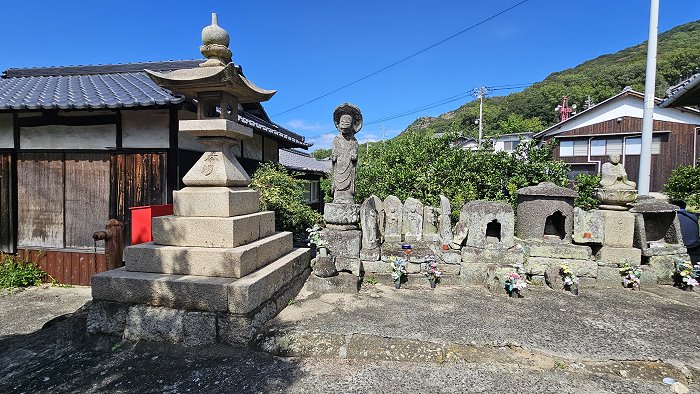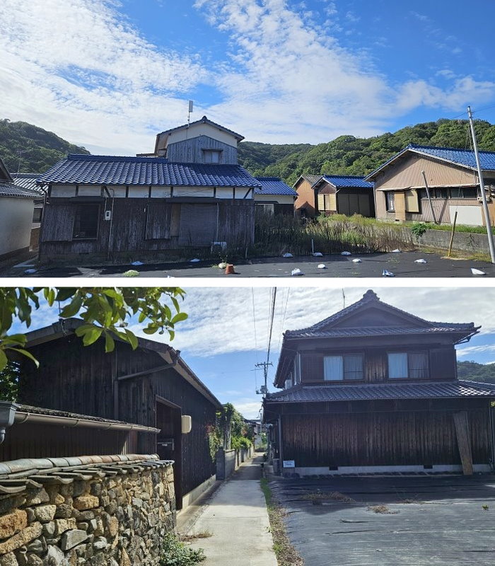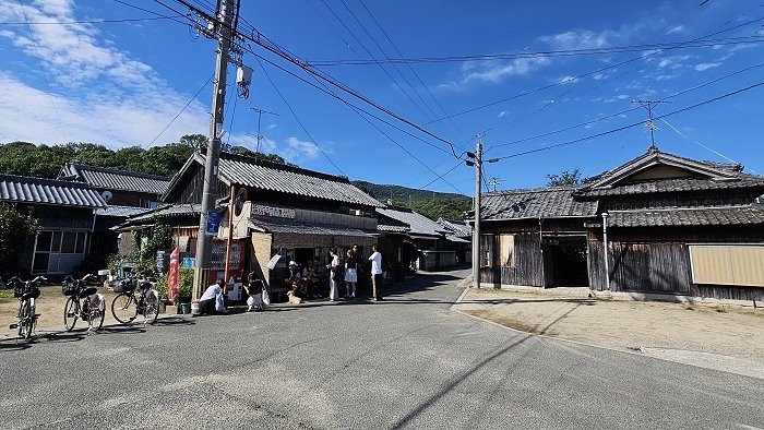 對著唐櫃港口的這家民宅是經營自行車出租,門口是排隊等著租車的人。台阿桑資深力衰,所以利用島上「豊島町営バス」為移動交通工具。