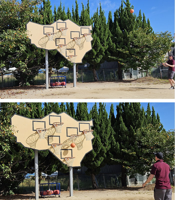te14《無人勝出-多重籃框》,西班牙藝術家Llobet & Pons雙人組 之作品,立於2013年的瀨戶內國際藝術祭,長駐至今。因為有許多籃框,所以能依照自己喜歡的規則打球;藝術家希望創造島上居民和遊客都能快樂打籃球的場所。
