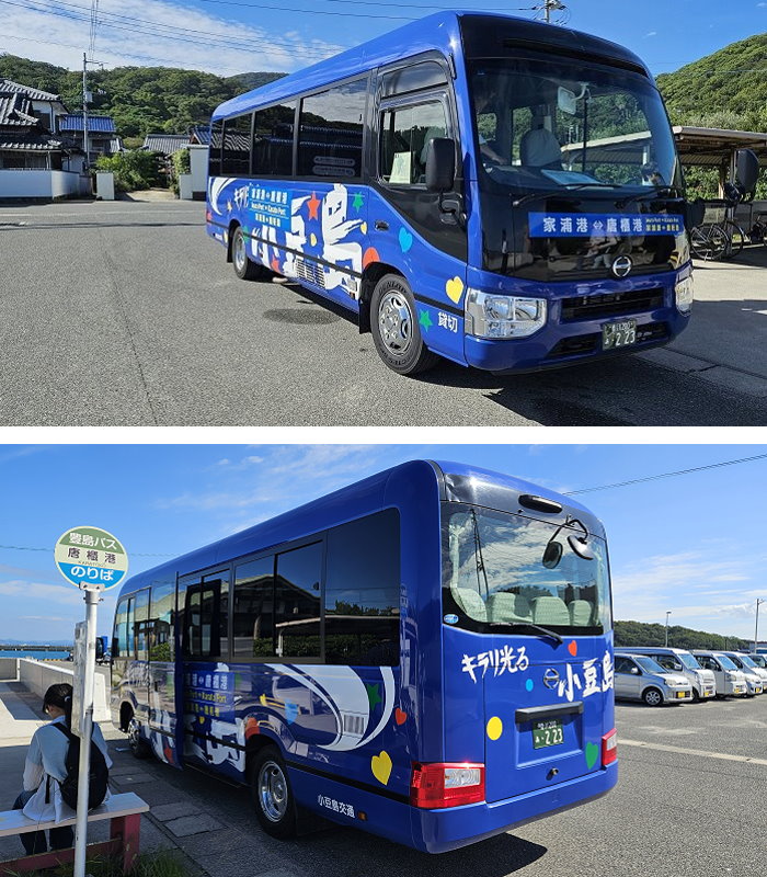 往來家浦港與唐櫃港的豊島町営バス,車身卻打著小豆島的廣告。豊島町営バス單程車資為400日元,若有多趟乘車需求,可於瀨戶內國際藝術祭官方app購買「巴士一日券」(1500日元)。