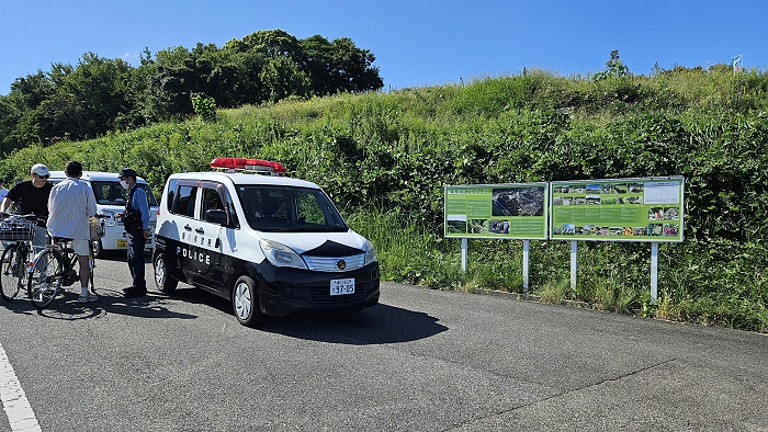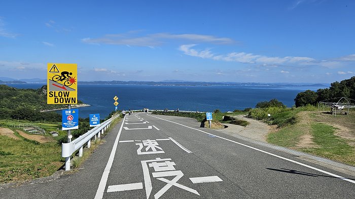 因為是陡坡,還特別豎立給外國人看的警告標誌;右側立有藍色招牌的蜿蜒小路即通往「豐島美術館」。
