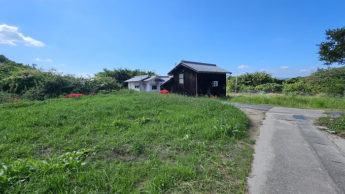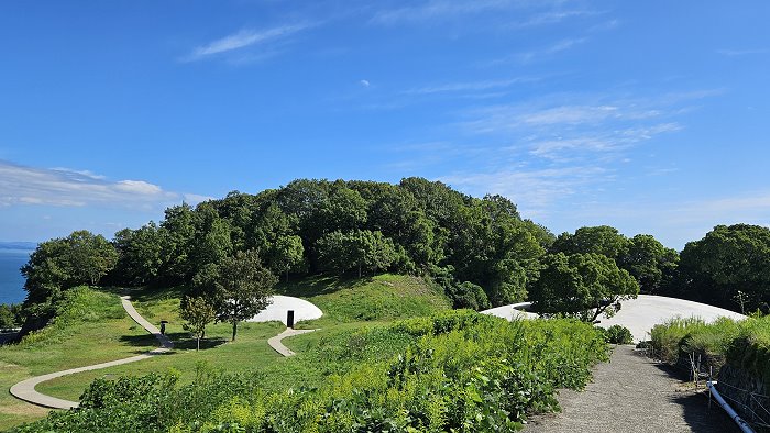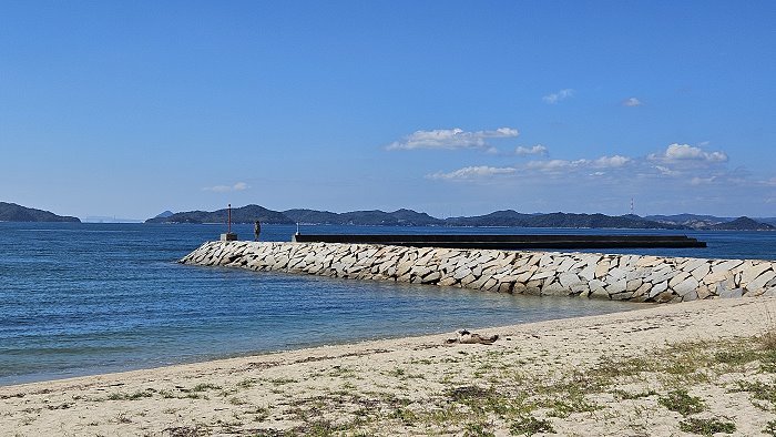 自唐櫃港約5分鐘車程抵達「豊島美術館前」バスのりば,下車就能看到縣道255號「海へ続く坂道(延伸到海的坡道)」,以坡道末端彷彿與大海連接而知名。