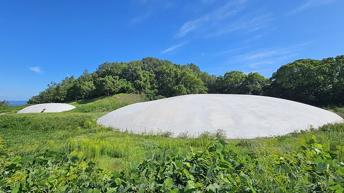 這座白色混凝土殼體結構建築(↑圖右側)長約40公尺,寬約60公尺,最高處達4.3公尺,宛如白色水滴,覆蓋唐櫃山丘的綠地上。左邊為咖啡廳&紀念品店。