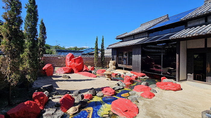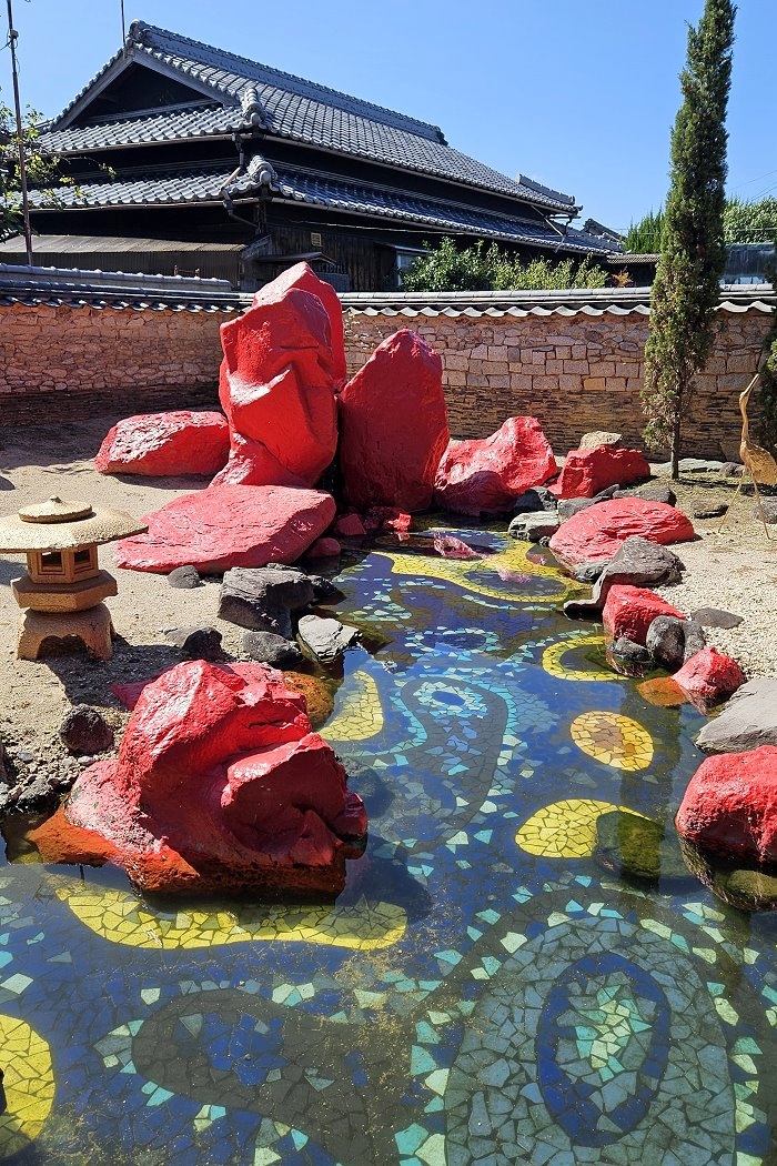 屋外石庭和池塘中展示色彩強烈的藝術裝置。