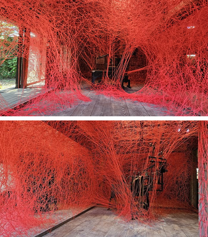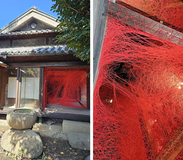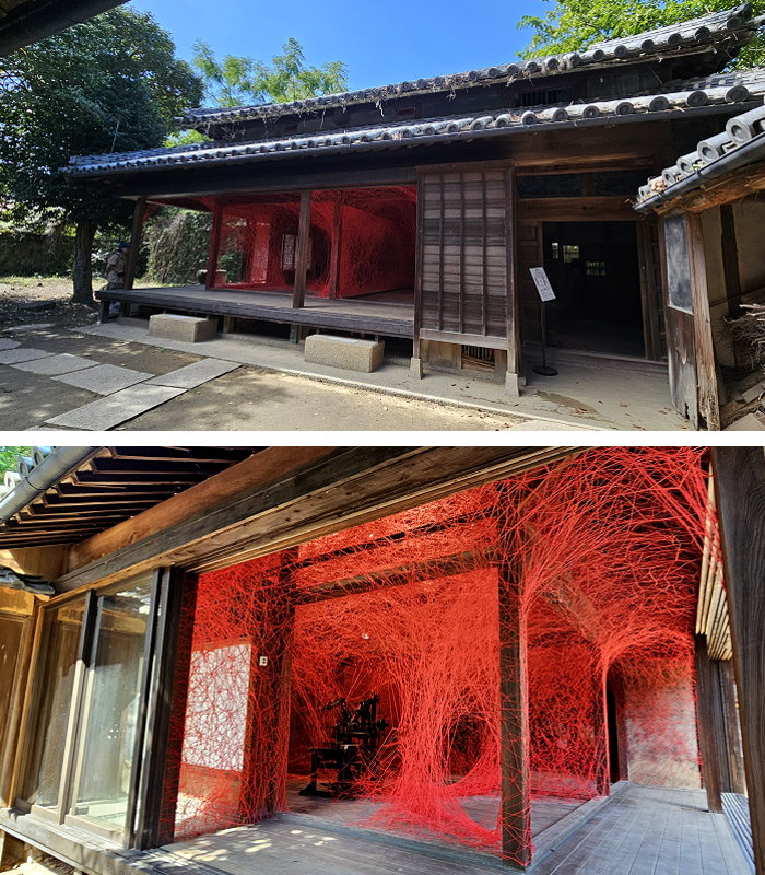 《線的記憶》為日本當代藝術家塩田千春於2025年瀨戶內國際藝術祭全新創作,運用其散佈在房間線網的代表性手法構築於古民宅當中,紅線彷彿蛛網交錯出疏密、狂亂的空間。
