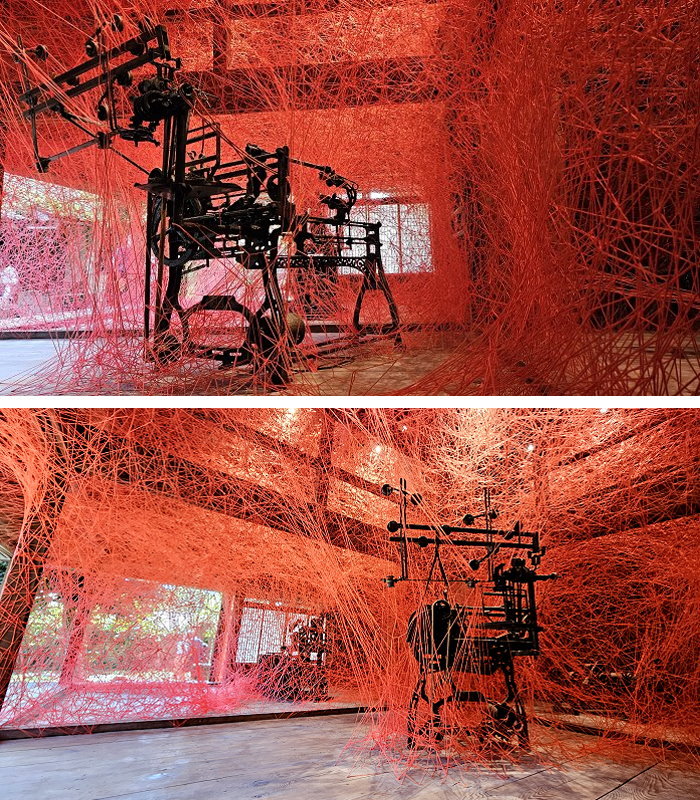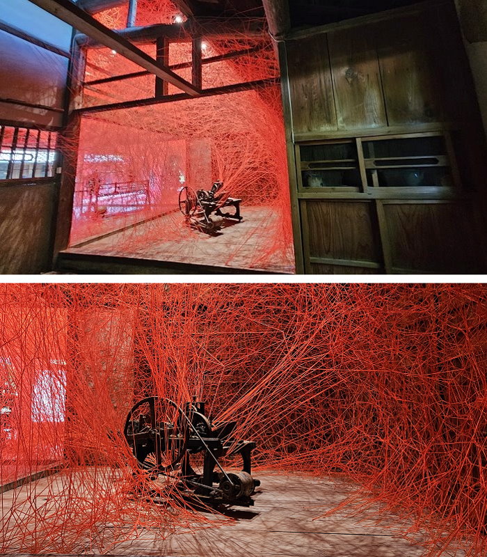 塩田千春用紅線在空間中編織成網,將素麵機與空間連結,藉由這些帶有居民回憶與情感的機器用紅線串起記憶,串連起過去與未來的時間感,保存島嶼的記憶與生活方式。