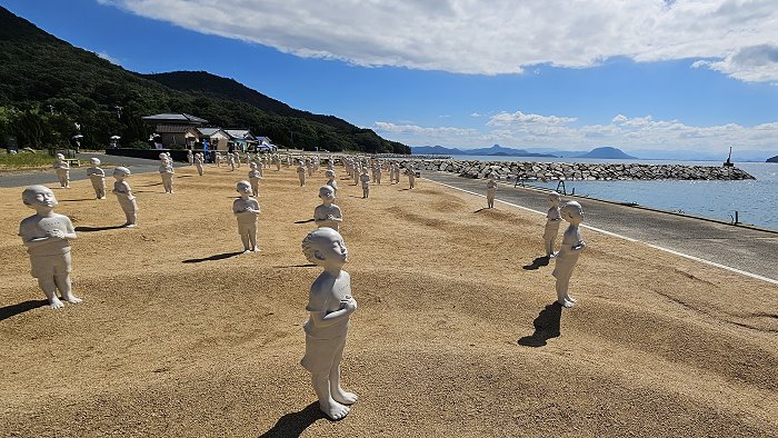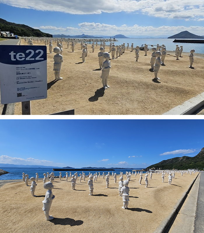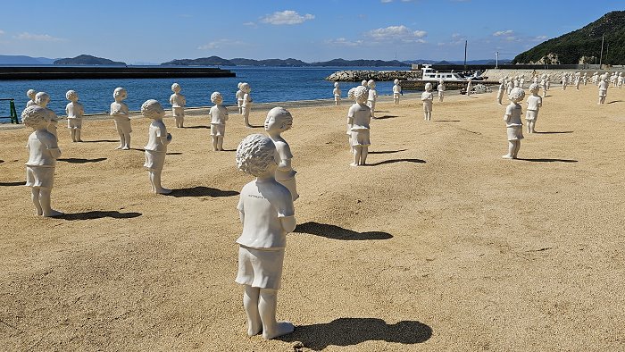 每個兒童面向自己國家的方位,胸前編號數字代表該國首都與豐島的距離,後背則標註首都的經緯度。這些兒童雕塑特別委由京都400年歷史的窰廠,製作永久性的世界小孩,長期駐足在豐島甲生港,成為2025年瀨戶內海藝術季豐島上的焦點。