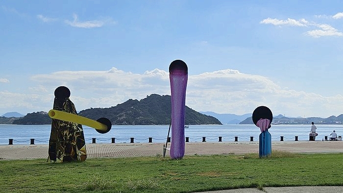 《宇野小黑鯛》則是立於2019年第4屆瀨戶內國際藝術祭,結合溜滑梯設計,讓人爬上魚口從魚尾巴滑出。