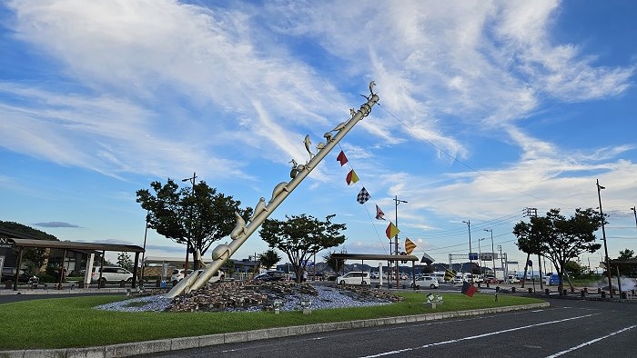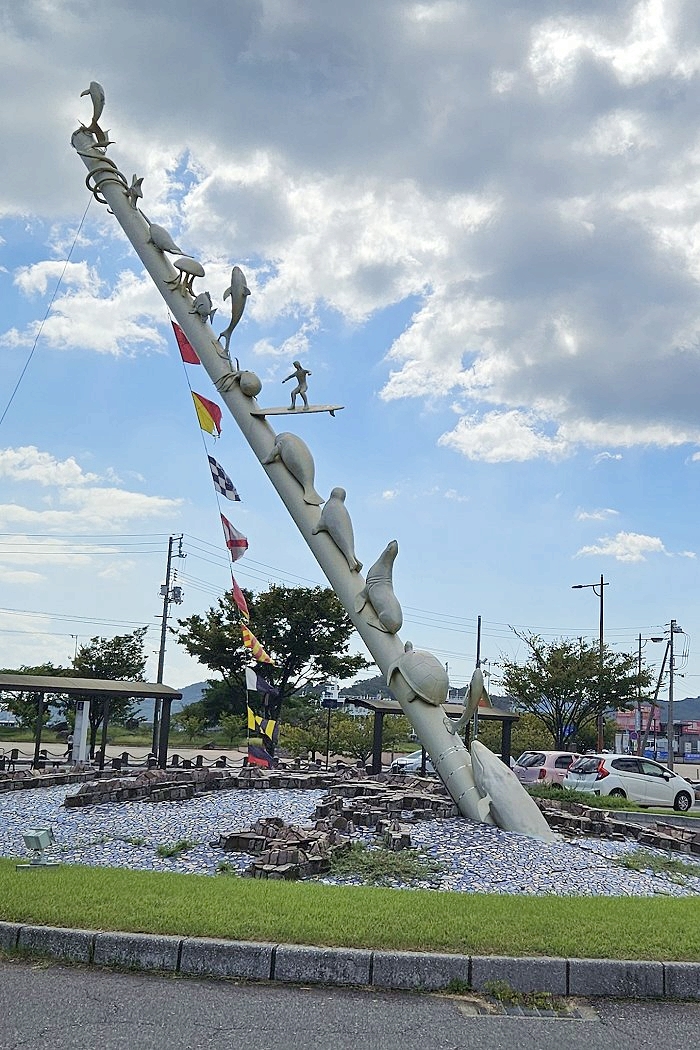 位於宇野站前廣場的雕塑作品《Bon Voyage,海からの贈り物(來自大海的禮物)》,藝術家白井美穂之作。