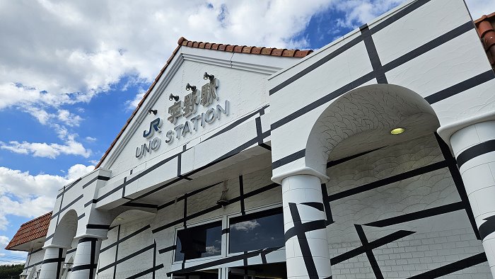 un05《JR宇野港線 藝術計畫》,是義大利藝術家Esther Stocker在2016年執行「JR宇野港港線藝術計畫」作品之一,藝術家於宇野線的四處車站作造型藝術,在宇野車站外牆透過白色牆面與黑色線條創造出立體視覺錯覺效果。