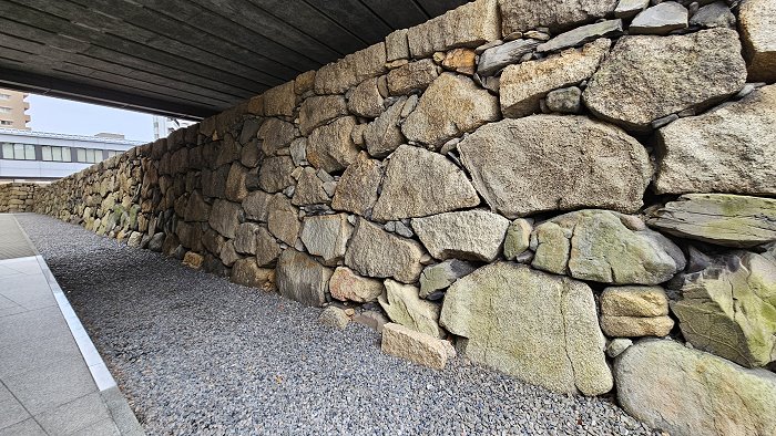 艮櫓與旭門之枡形構造,這裡的石垣用成形的大石塊毫無間隙地堆積而成,這種方式被稱為「切入接」。