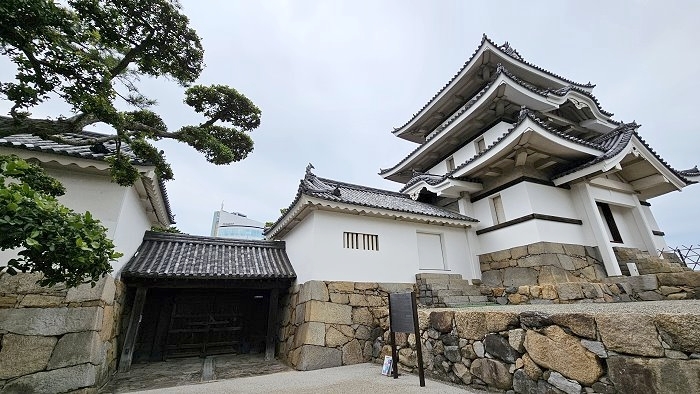 被指定為國家重要文化財產的月見櫓、水手御門及渡櫓。
