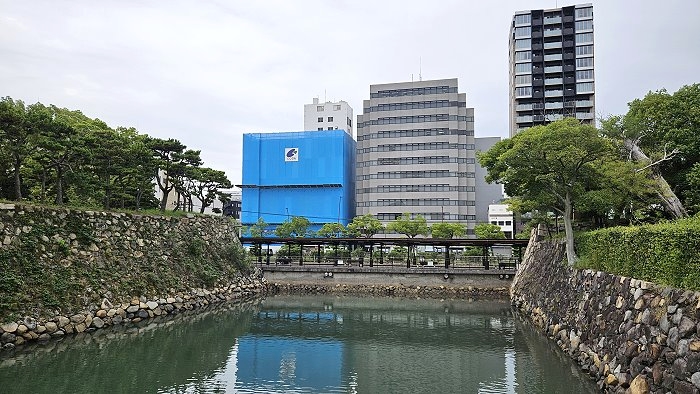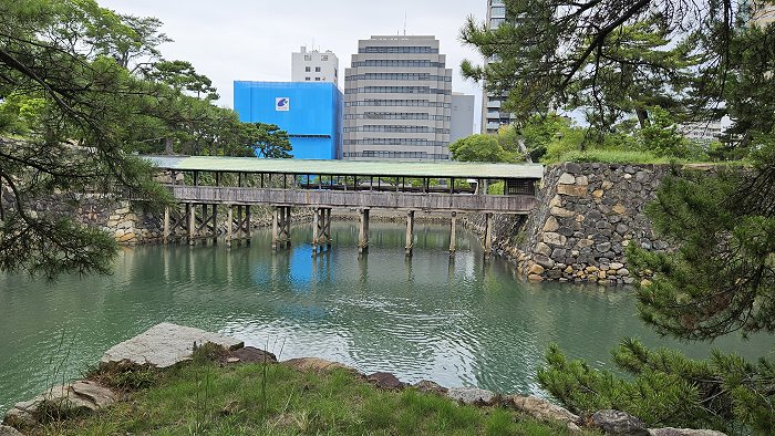 鞘橋西面向,內堀的外圍市區方向,為琴平電鐵的「高松築港駅」。