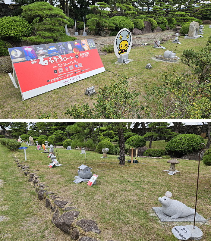 立於高松城跡外《地表より−森》石雕,為井上麦於2000年之作品。