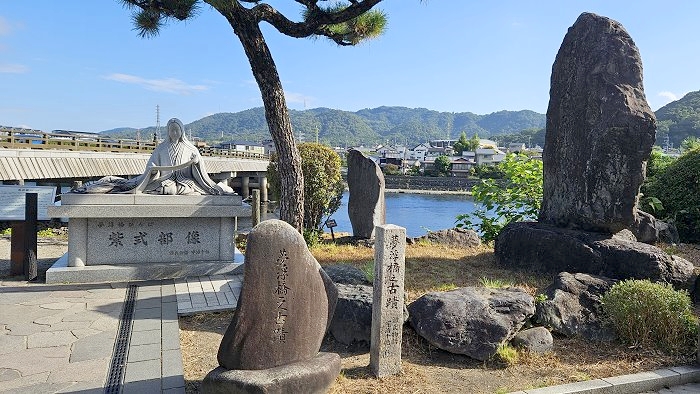 宇治川岸邊宇治橋旁的夢浮橋廣場坐落著「紫式部 像」及「夢浮橋古蹟」石碑。宇治橋作為《源氏物語·宇治十帖》的場景,而「夢浮橋」是《宇治十帖》最後一帖,並無實際的橋。