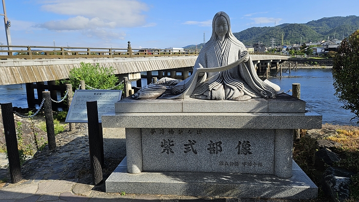 紫式部像,是為紀念平安時代知名女作家紫式部及其代表作《源氏物語》而設立的雕像。雕像高約1.8公尺,呈現她端坐持卷的姿態,彷彿在沉思其筆下的故事情節,造型優美典雅。