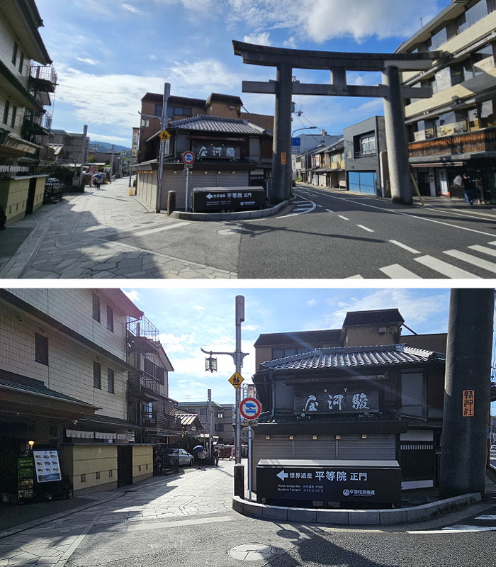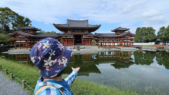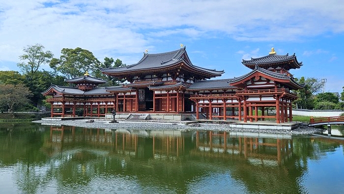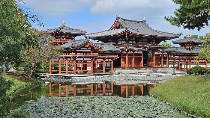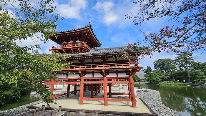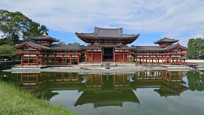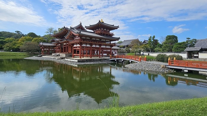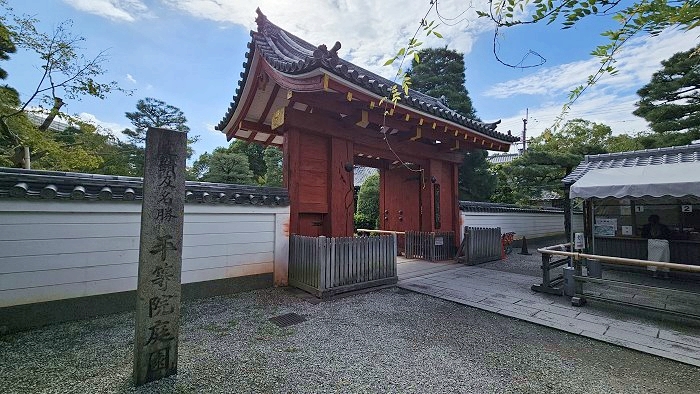 平等院,位於京都府宇治市宇治川西岸,由於當時的日本人深信永承7年 (1052年)即為「末法時期」元年,許多貴族為了去世後能到極樂世界,開始競相建造華麗的堂塔,在平安時代權傾一時的輔政大臣藤原賴通將繼承自父的別墅建為天台宗的寺院「平等院」;於永承8年(1053年)引入宇治川水,依佛教末法之境,在水池之西建造阿彌陀堂(即今之鳳凰堂),水池之東則建構象徵今世的拜殿,是為「淨土庭園」,體現當時的平安貴族對於進入極樂淨土的渴望,至今仍可透過平等院一窺藤原氏族當年的榮華景象,其規格更為後來日式庭園的參考指標。平等院作為「古都京都文化遺產」建築群之一,於1994年列入了世界文化遺產名錄,是京都極具代表性且擁有高度歷史價值的重要史蹟之一,每年吸引著上百萬遊客前來觀賞。