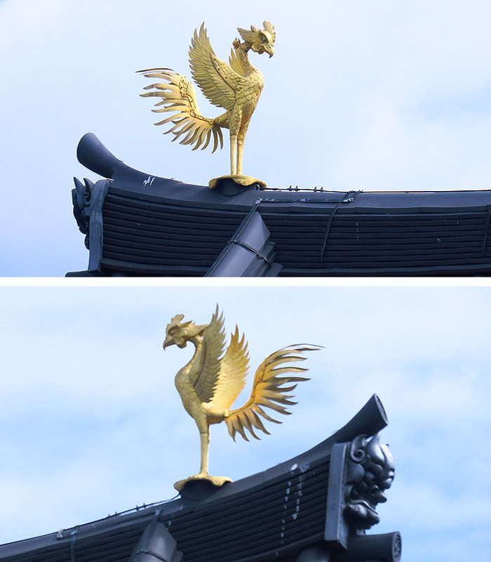 鳳凰堂中堂屋脊南北兩端的一對銅鑄鍛造鍍金鳳凰,原安置於平安時代(11世紀),北座高95公分, 南座高98公分;兩尊雕像均因空氣污染而導致生鏽嚴重,現立於屋脊上的是複製品;原件已被指定為國寶,保存於「鳳翔館」展出。