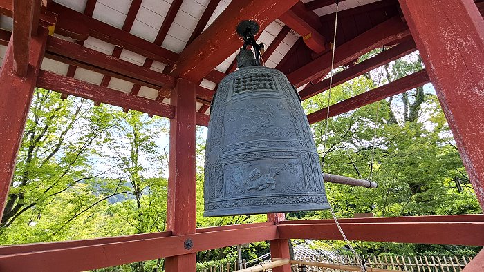這是平安時代最具代表性的梵鐘之一,亦為天下「三大名鐘」之一。鐘上裝飾有龍鬚垂直向上逆立而起的龍頭,寶相華唐草圖上還繪有鳳凰、舞蹈天人等圖案。因空氣污染而導致生鏽嚴重,現懸於鐘樓的是複製品;原件的梵鐘被指定為國寶,已保存於「鳳翔館」展出。