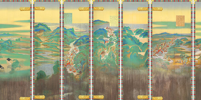 鳳凰堂中堂壁扉畫,為現存日本最古的大和繪風《九品來迎圖》,依生前的行為與信仰,臨終之際阿彌陀如來的來迎從上品上生至下品下生分為9階層,其樣貌繪於堂內門扉或壁上(圖文引自官網)。