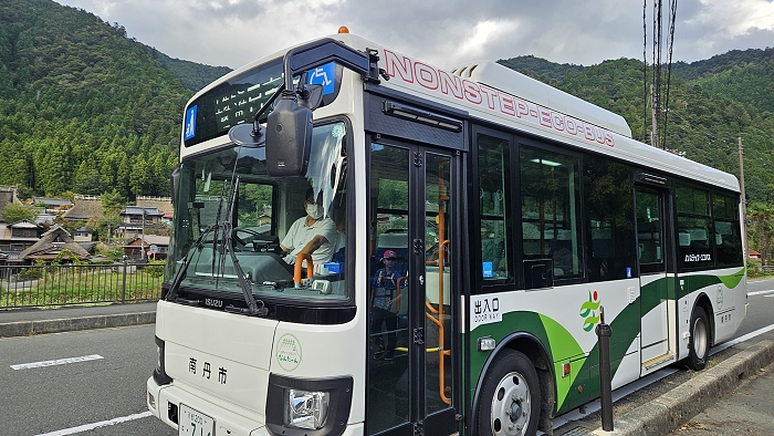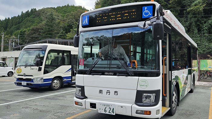 出了日吉駅往左側停車場有巴士站牌,再換乘南丹市営バス(↑圖右車)的「美山園部線」前往美山町茅葺之里。