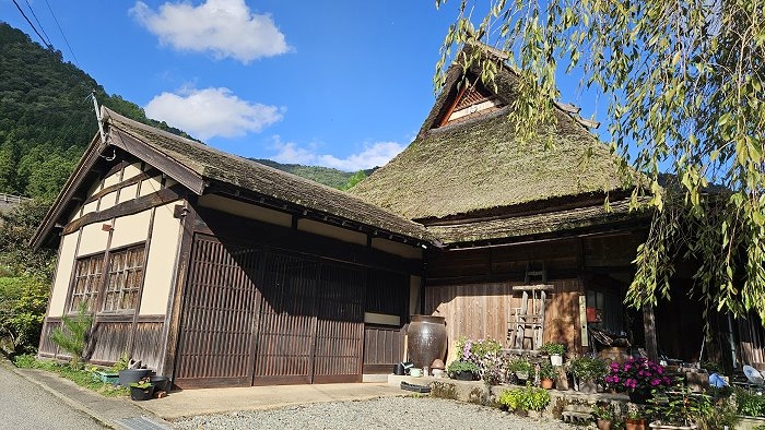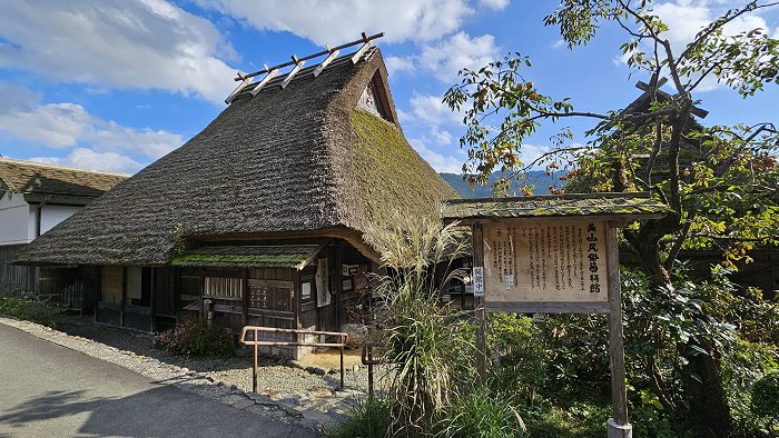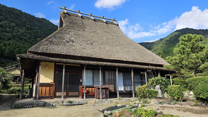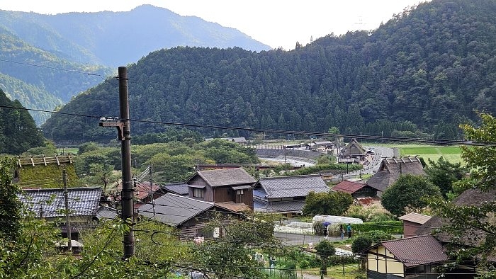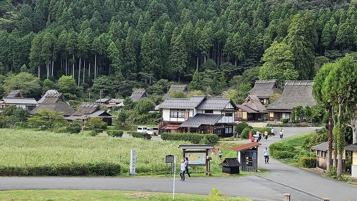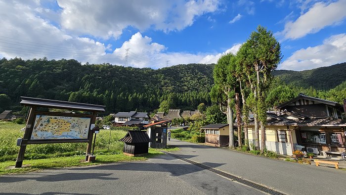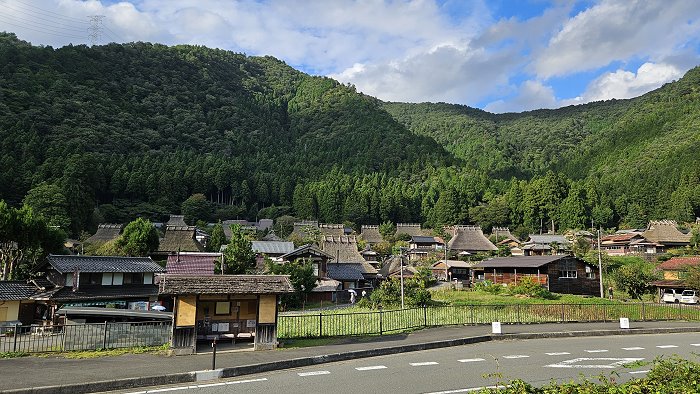 約65分鐘車程看到山林環繞錯落有致的茅葺屋落景觀即是地達目的地,在「北/かやぶきの里(茅葺之里)」ばすのりば下車。