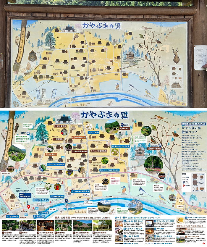 二者皆為「有限会社かやぶきの里」經營的餐廳與商店,前者以手打蕎麥麵為主的餐廳,後者販售日式和菓子、布丁等甜點兼紀念品土產店。因為大型停車場就在那裡,當時看到團客已經大批出現,就沒過去了。