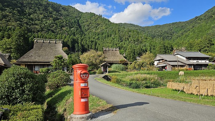 位於茅葺之里北集落入口的紅色郵筒和茅葺屋宅同框,是到此不拍不可的場景。