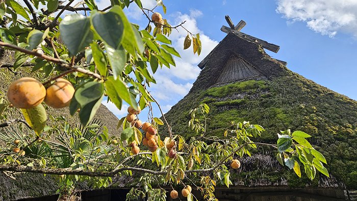 青苔是茅葺屋頂最自然裝飾,與澄黃的柿子色彩呼應成趣。