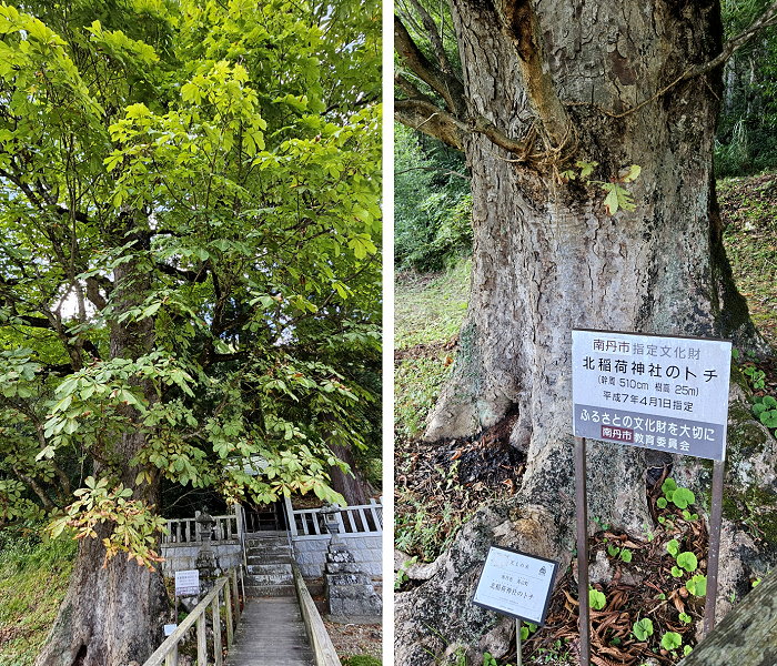 北稲荷神社的神木七葉樹(橡樹),樹齡估計超過400年,樹高25公尺,樹幹周長5.1公尺,被指定為南丹市天然記念物。