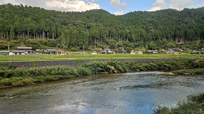 從巴士上清楚看出:美山町的主屋向南,與前方的由良川平行。