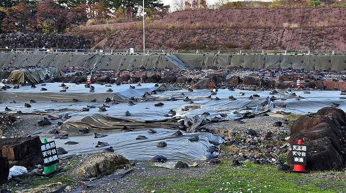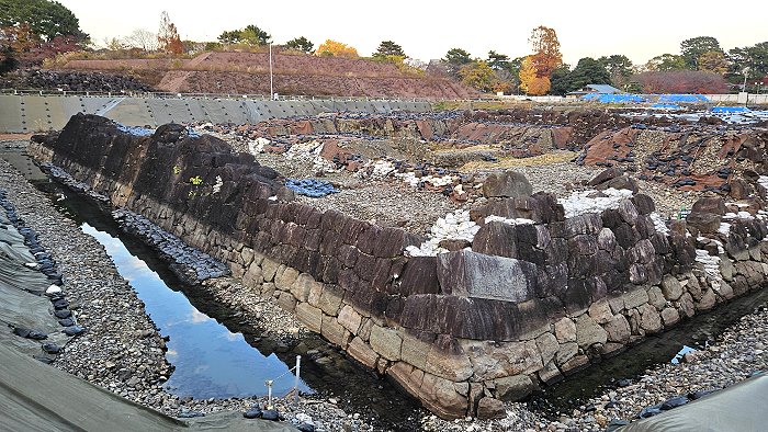 慶長期天守台跡(↑圖)。調查中發現了「天正期」與「慶長期」兩個時期的天守台石牆。尤其是慶長12年(1607年)時所建的天守台,東西約63公尺、南北約69公尺,規模為日本城廓史上最大的天守台。