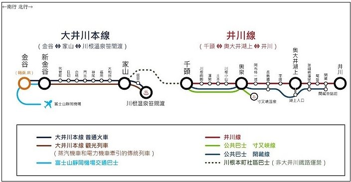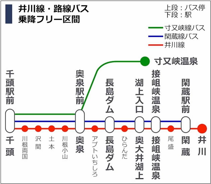 「井川寸又峡周遊きっぷ(井川寸又峡周遊券)」使用路線,涵蓋:井川線鐵道、接岨峡温泉及寸又峡温泉(夢之吊橋)巴士。