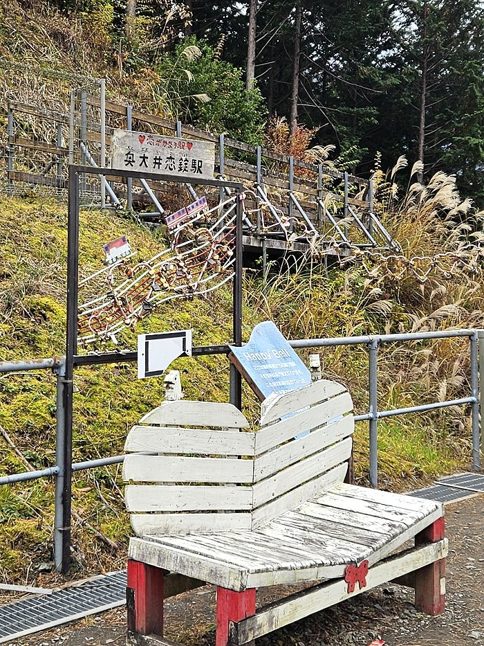 心型的候車椅,後方「愛の恋錠」,就是掛愛情鎖之處,心型鎖鏈一路連接至幸福鐘。在奥泉駅、井川駅有販售愛情鎖提供戀人購買,搭車至此許願懸掛,也替車站帶來觀光效益。