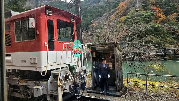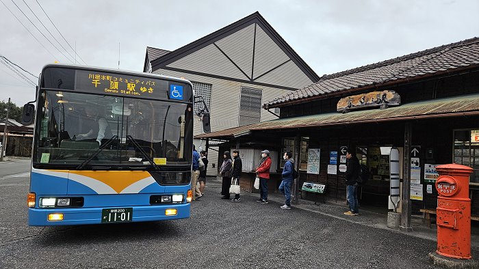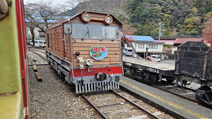 自家山駅搭乘川根本町町營巴士約45分鐘車程抵達大井川本線千頭駅,在此轉乘井川線的列車。