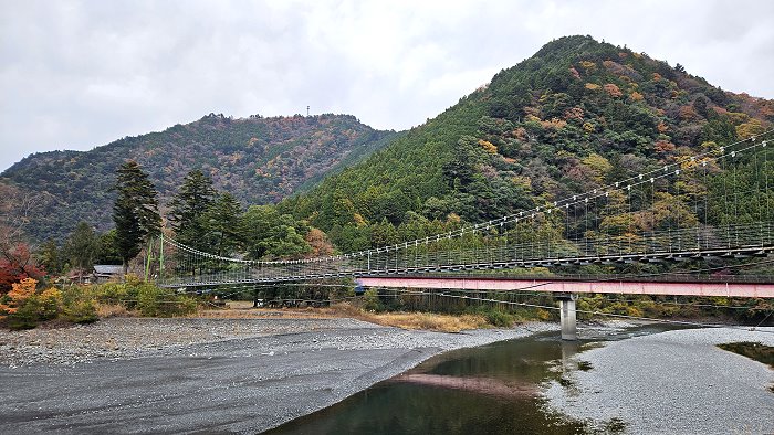 橫跨大井川的「泉大橋」,與紅葉呼應。