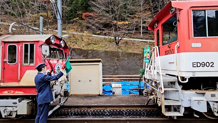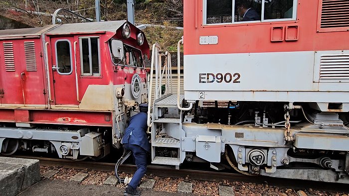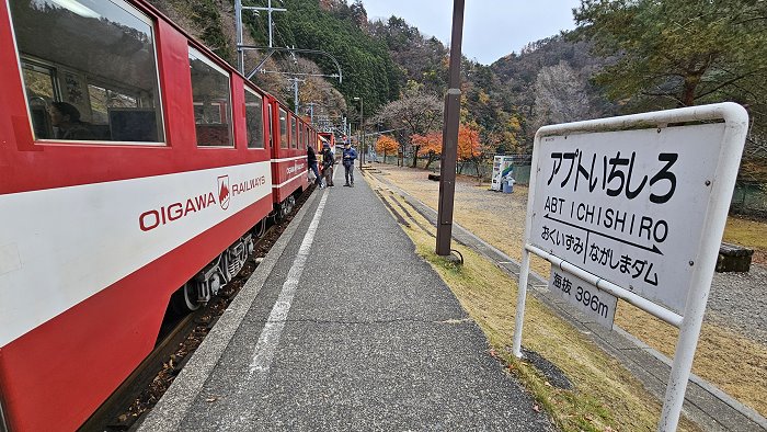 列車停在海拔396公尺ㄉ「アプトいちしろ(Abt市代)駅」,專門為了ABT式軌道而設置的調度站,要下車來看在列車後方加掛阿布特式電氣機關車頭,利用動力將車身推進,直到電車爬升至最陡峭的長島水壩駅,這也是日本唯一的「ABT 式齒軌系統」鐵道。