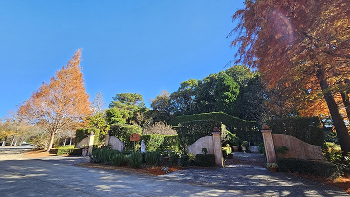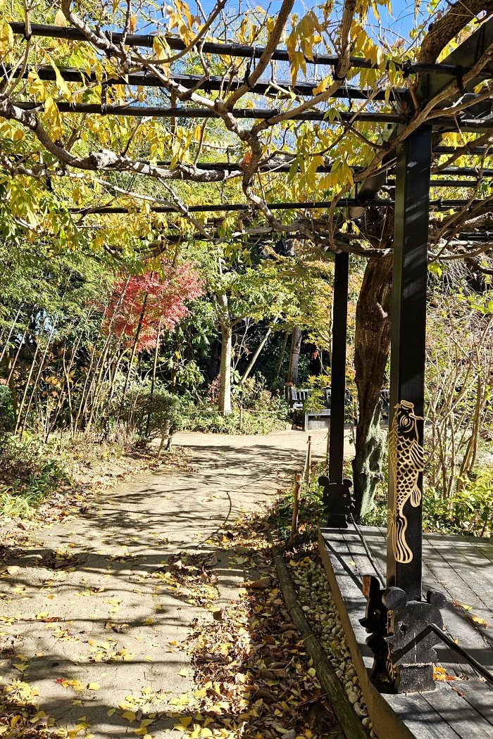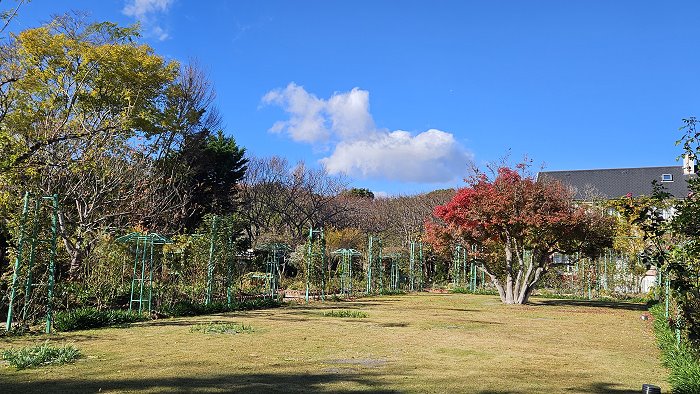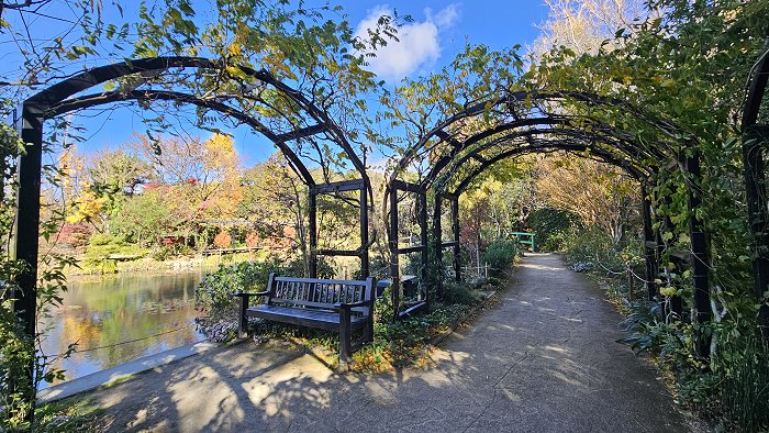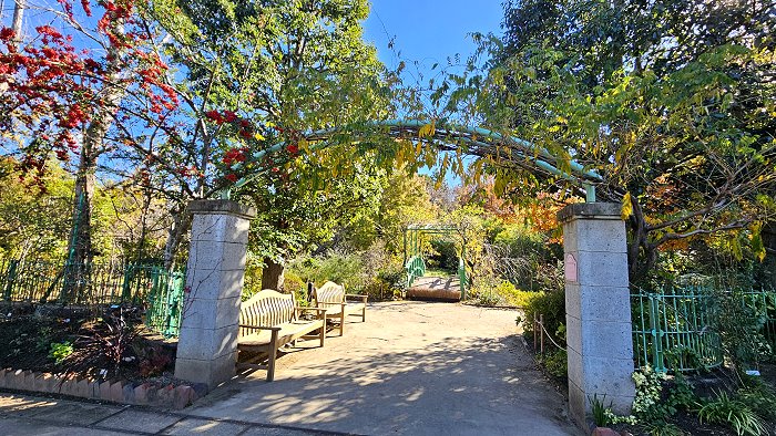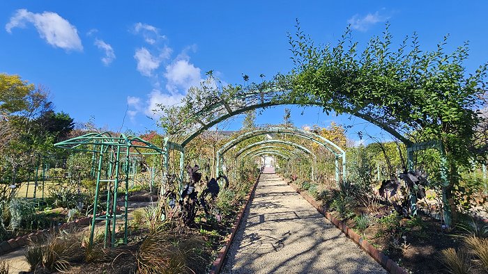 花の美術館的玫瑰花拱門,這裡有超過250個品種的玫瑰,12月初只見葉子攀爬。