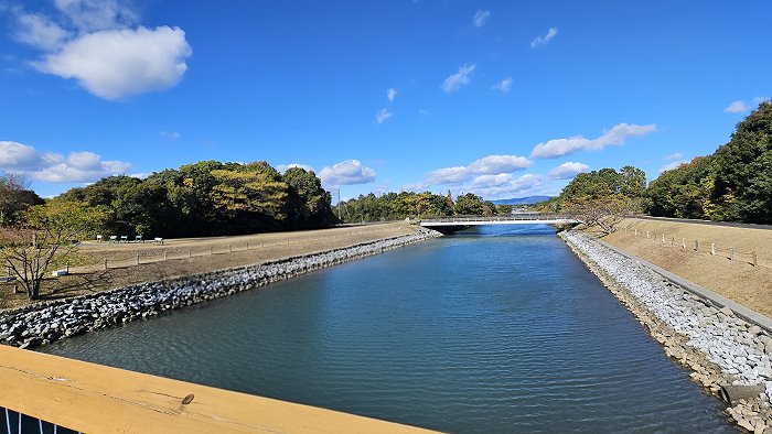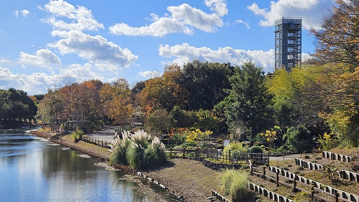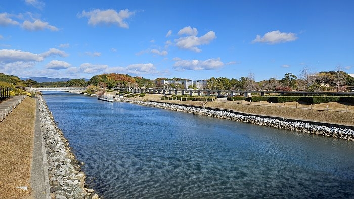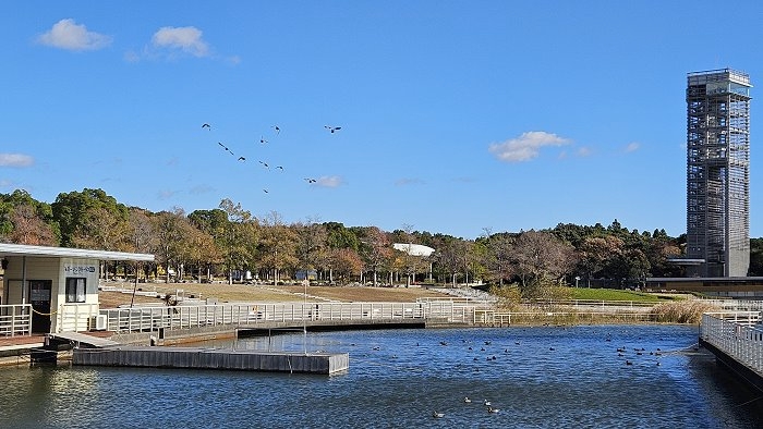 遊園船會沿著「東西水路」行駛,穿行在濱名湖花園公園間;後方是園區最高建築──展望塔。