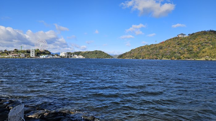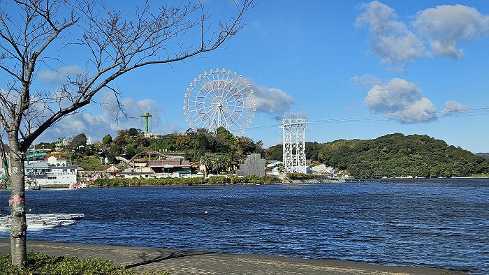 眺望濱名湖畔的度假型遊樂園「濱名湖 Pal Pal」,旁邊白色鐵塔屬於「館山寺纜車」,這是日本唯一的跨越湖面的空中纜車。