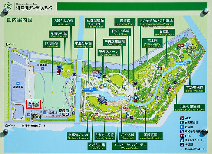 浜名湖ガーデンパーク(濱名湖花園公園)園區圖(圖引日本Garden Vision網頁)。濱名湖花園公園總面積達約56公頃(約12個東京巨蛋),園區劃分為「西側エリア(西側區)」、「街のエリア(街之區)」和「里之區(里のエリア)」。全年免費,停車場也不收費。