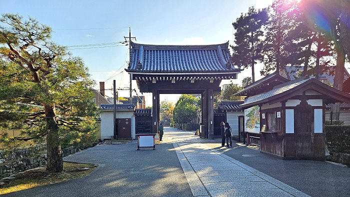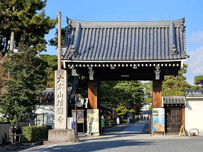 從京都御苑的北側,出今出川御門向北行走,可以看到「大本山相國寺」的柱碑與総門。由於創建寺廟的足利義滿曾擔任「左大臣」,相當於當時中國的丞相(也就是相國)因此寺廟以此命名。