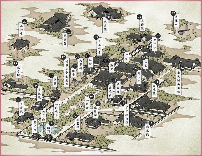 相國寺境内案内(圖引相國寺官網)。相國寺的佔地面積相當廣闊,約佔地40,000坪,境內共有12座塔頭寺院,而京都向來為大眾所熟知的金閣寺、銀閣寺,則屬於相國寺的山外塔頭寺院。