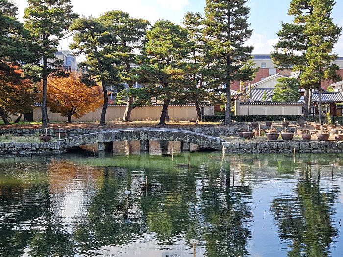 天界橋,橫跨放生池的石橋,曾於天文20年(1551年)「天文の乱」燒毀,現在的石橋是以當時的舊石材所重建。放生池中與岸邊布滿立有各樣品種名牌的荷花,夏日前來定為荷風十里。