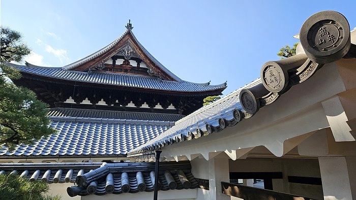 從連接迴廊眺望法堂,廊上的瓦當有山號「萬年山」字樣。