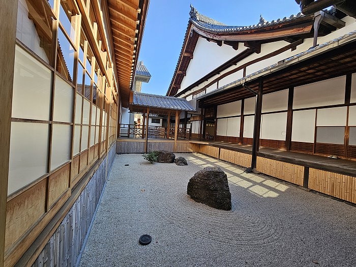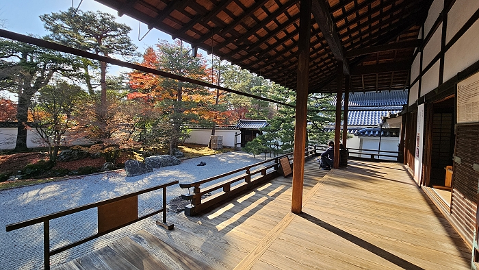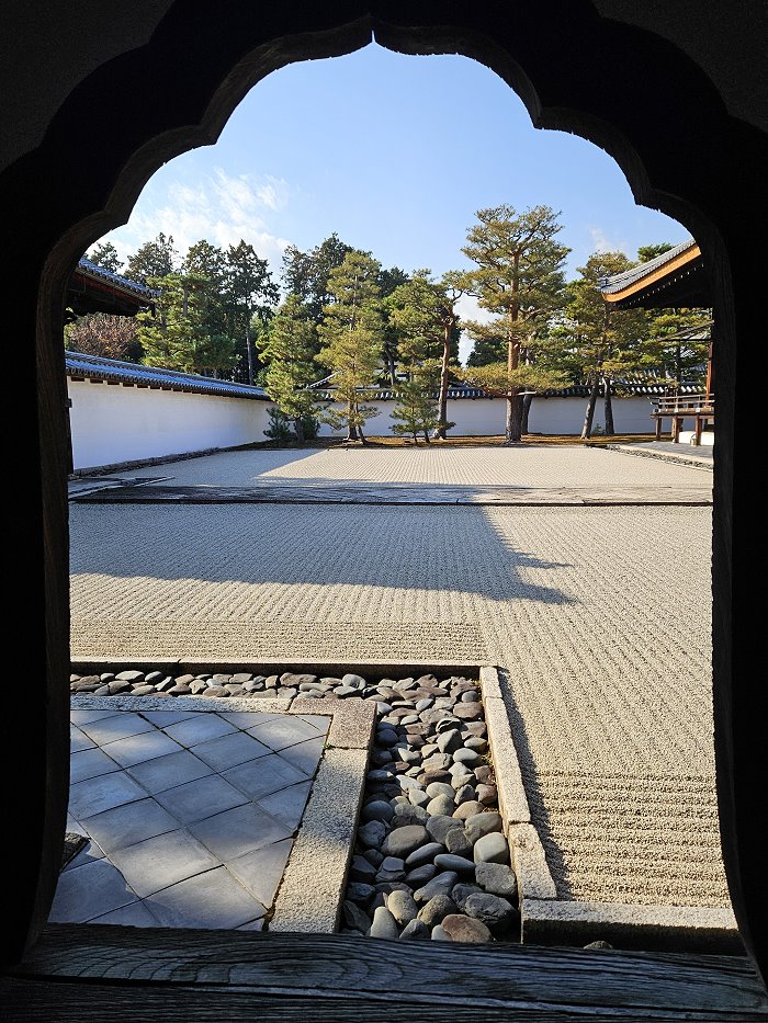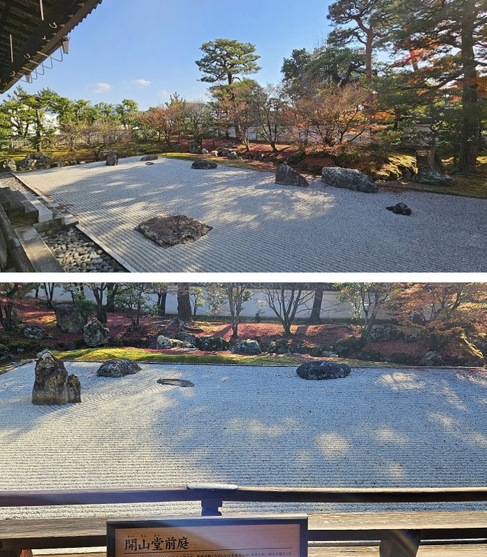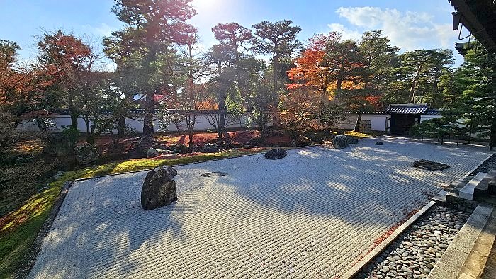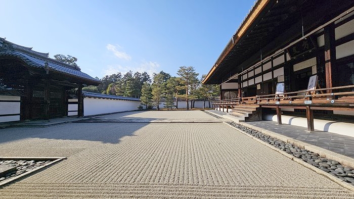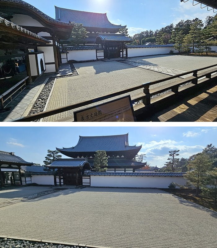 表方丈庭園,典型的禪宗寺院庭園,以白沙鋪砌而成,風格簡潔,不僅襯托出法堂與方丈的恢弘氣勢,更利用陽光反射白沙,提亮了室內空間。