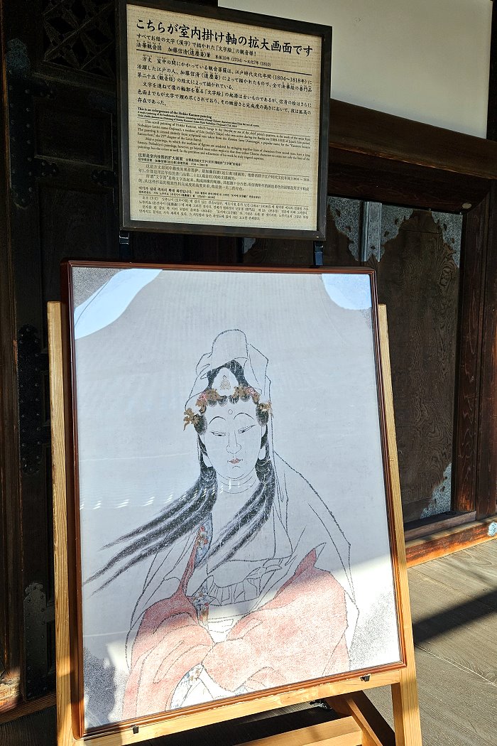 方丈裡放了一幅《法華觀音圖》(走廊上立有放大圖),由江戶時代的畫家遠塵齋所繪製,畫中觀音像的輪廓線其實是用法華經的經文所構成。