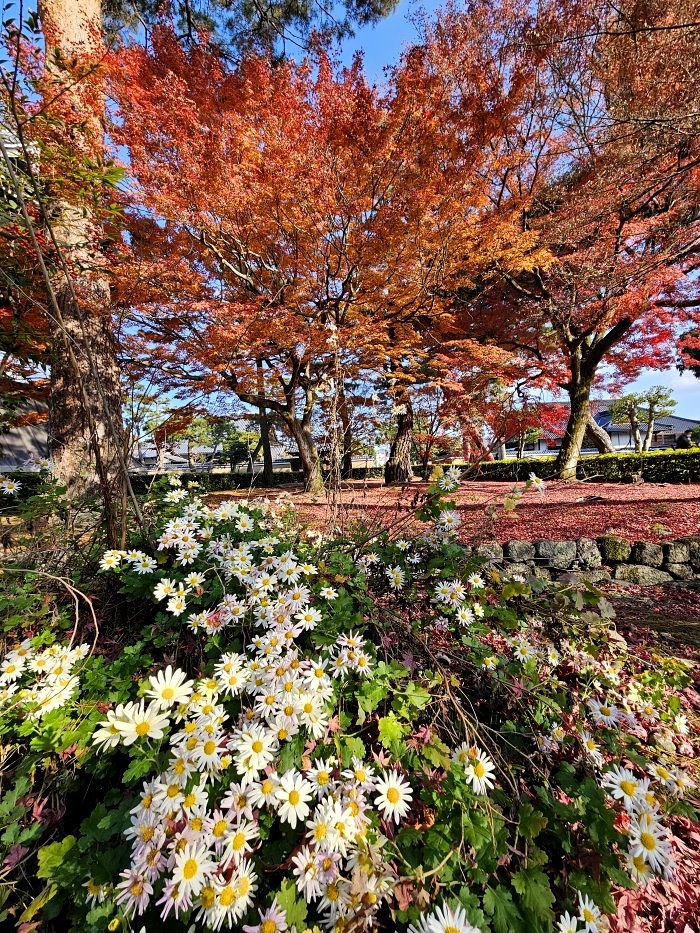 弁天社前的火紅楓林與潔白雛菊形成色彩的對比。