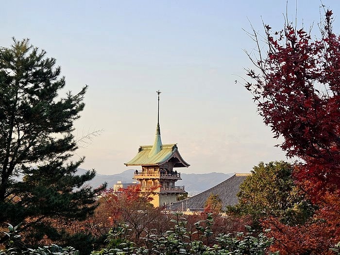 從高台寺境內眺望高度34公尺銅閣「祇園閣」。