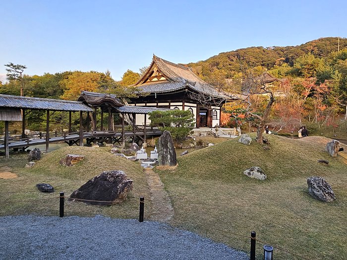 庭園内建開山堂與北書院連結的木造「樓船廊」橫跨「偃月池」之上,南側西岸象徵鶴島,當中的立石模擬鶴首。